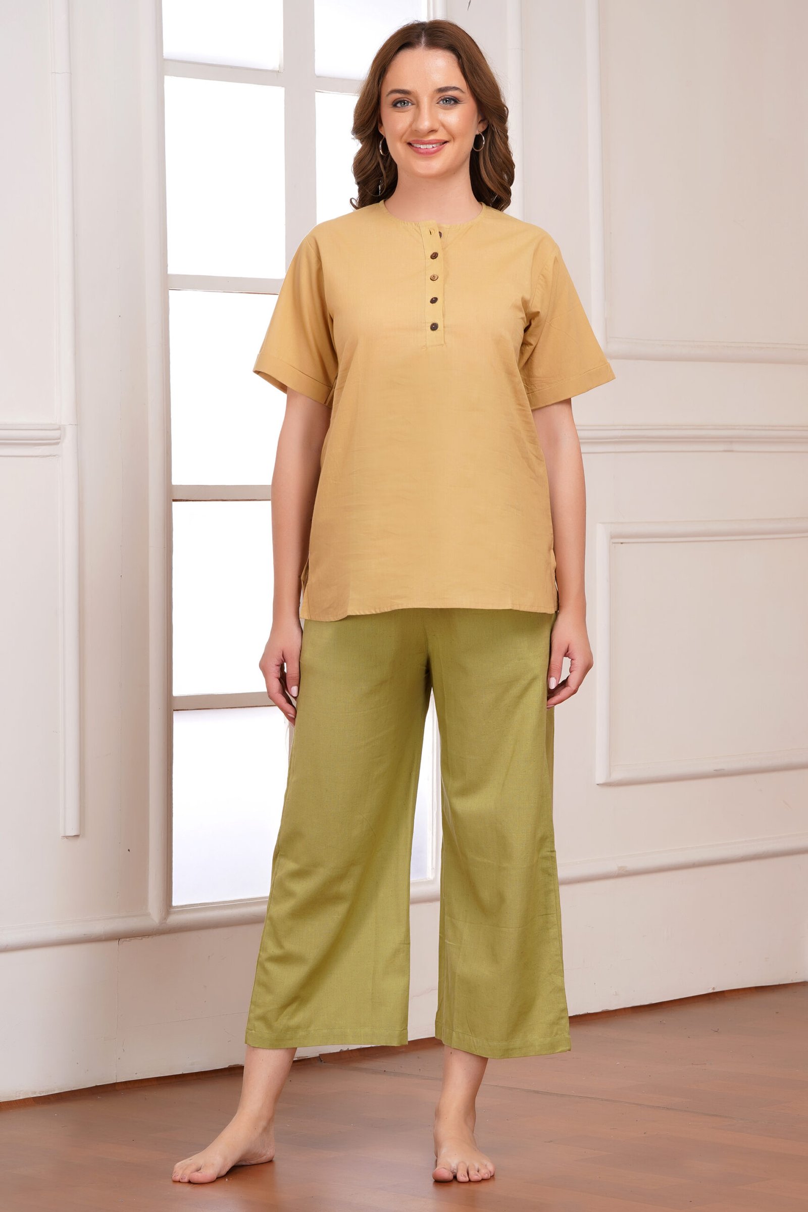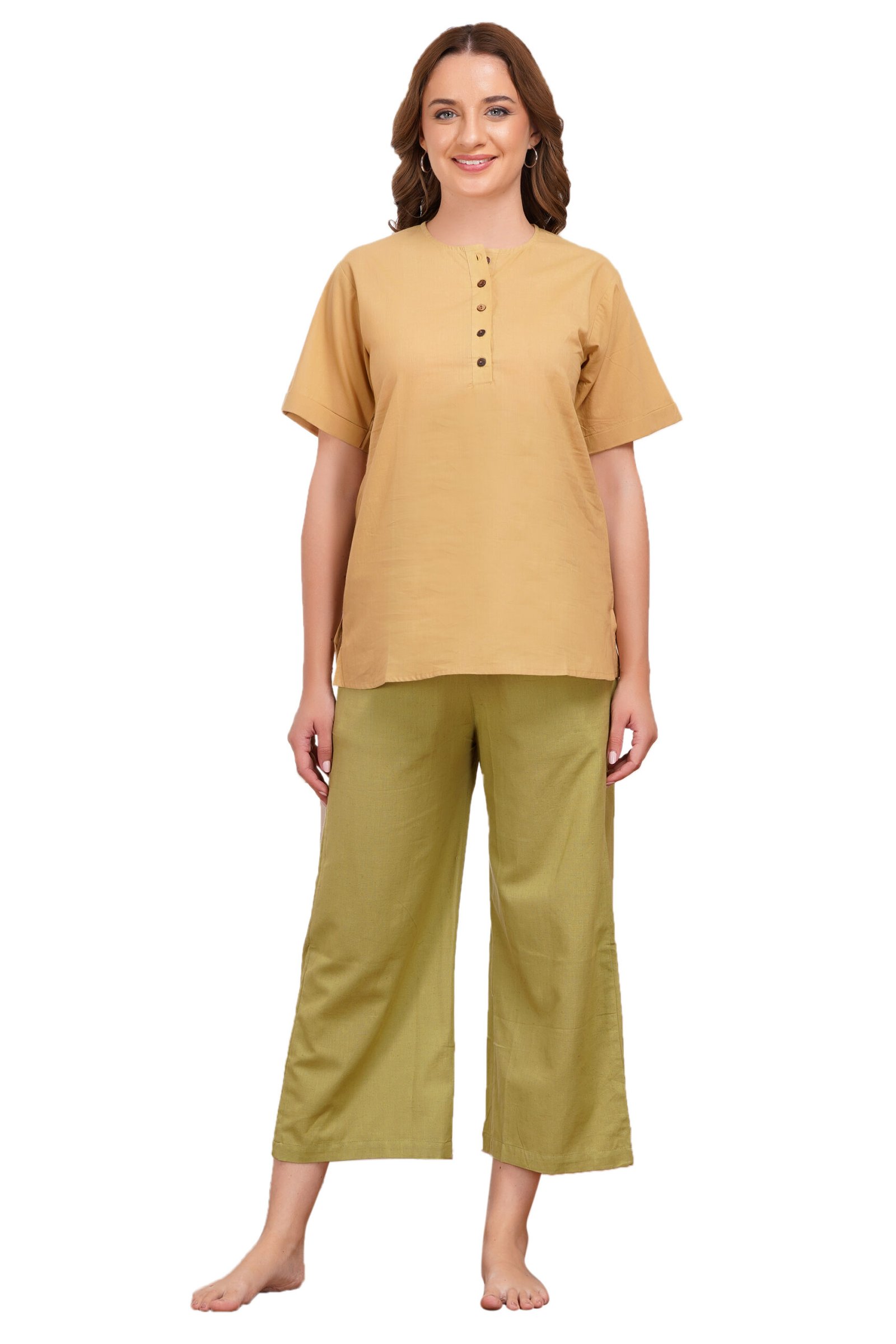 A complete set with beige collar neck top and pista green flared bottom makes it a perfect pair for any summer day. The material is soft on the skin and allows the body to breathe.