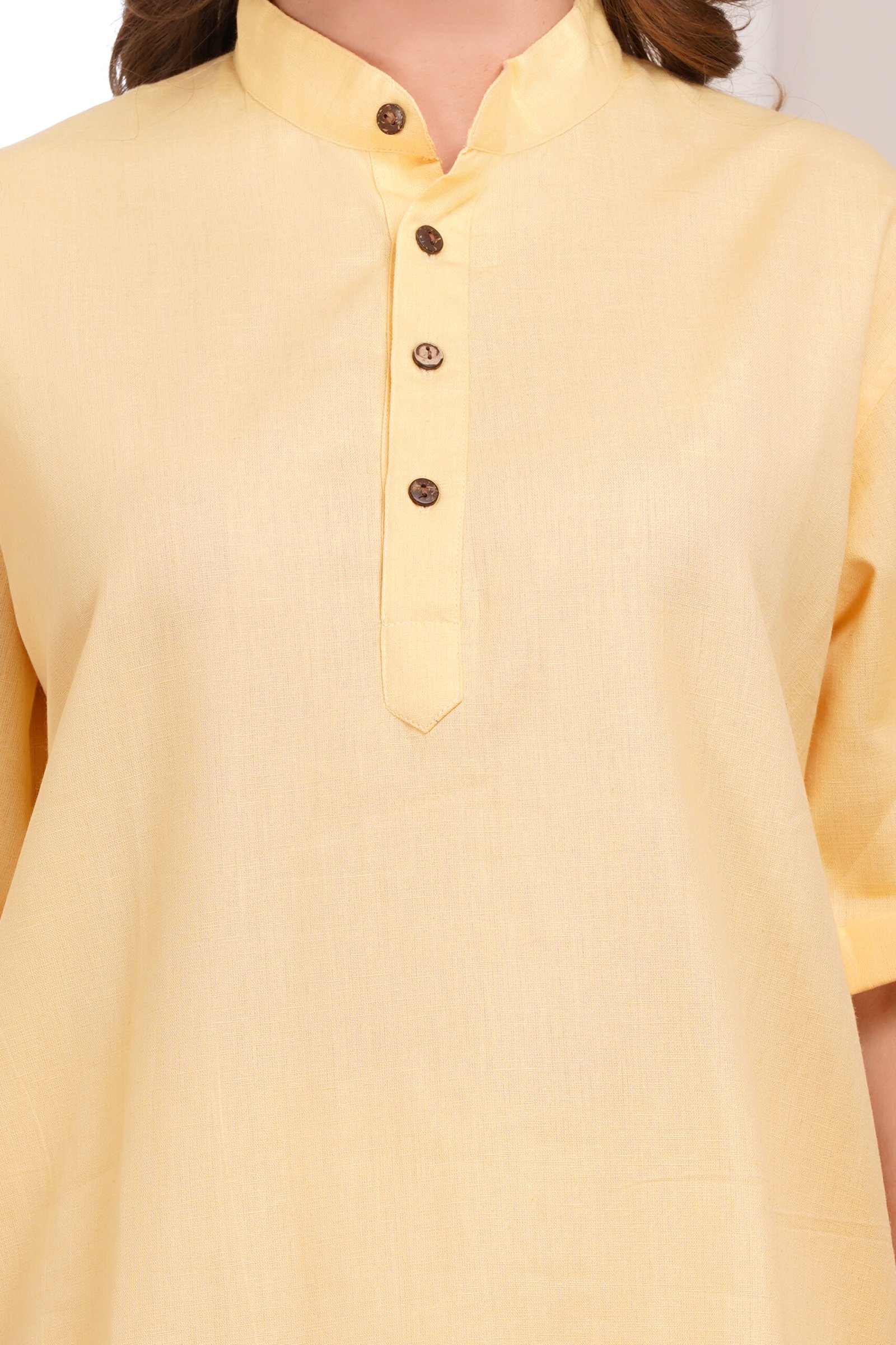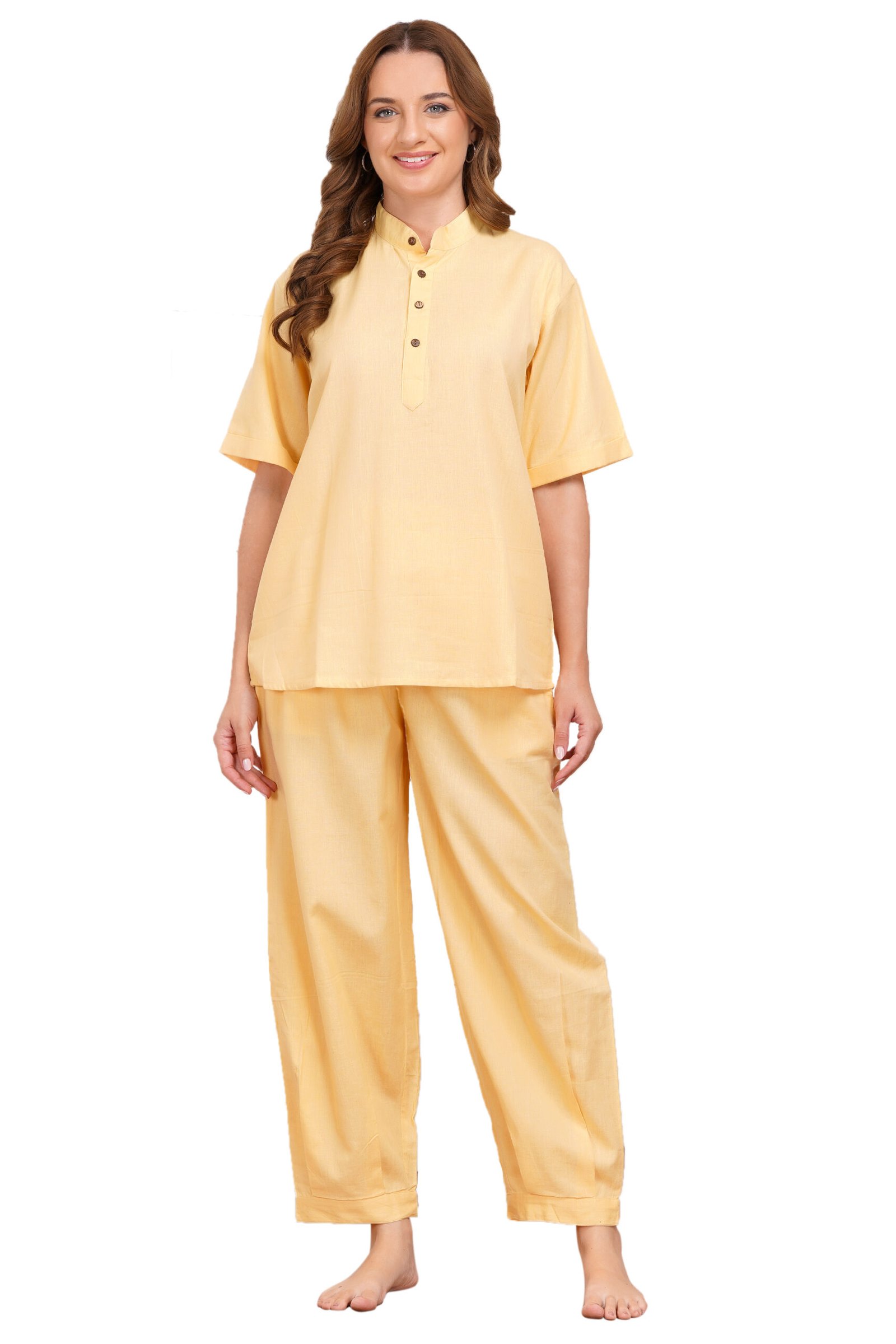 A complete yoga set with collar neck top and pocket bottoms make it a perfect pair for breezy & summery look. The material is soft on the skin and allows the body to breathe.